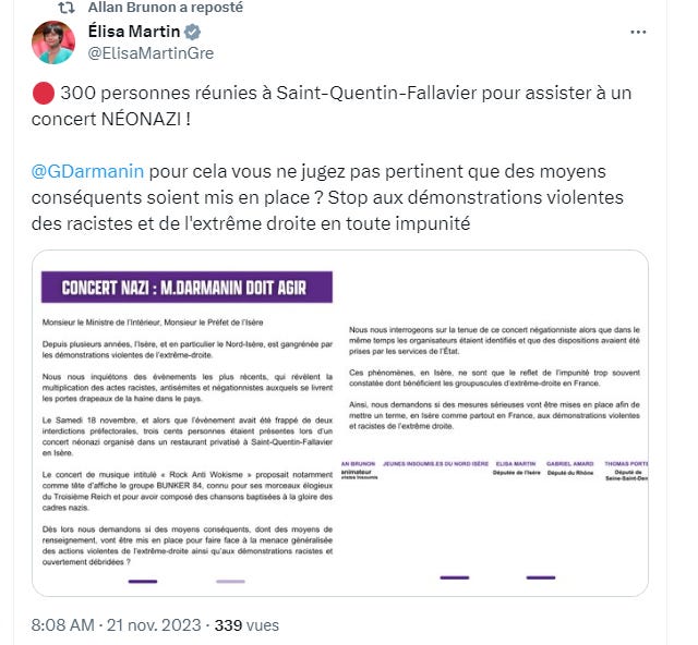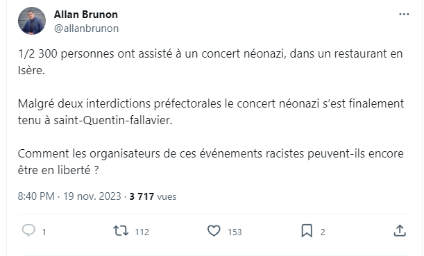 Enfin, toute cette affaire de concert néonazi a démarré sur la base de renseignements donnés à la presse par des “antifas” lyonnais, toujours les mêmes. Lyon Mag publie un tweet émanant d’Allan Brunon, un juriste de LFI qui a décidément bien du mal avec le droit. Il s’étonne que les organisateurs de cet événement soient toujours en liberté alors qu’aucune infraction n’a été constatée par les gendarmes, pas plus que la tenue du concert.