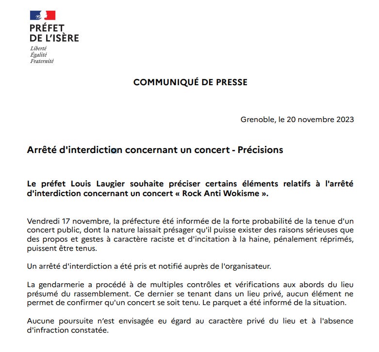 “Vendredi 17 novembre, la préfecture (de l’Isère, ndlr) été informée de la forte probabilité de la tenue d'un concert public, dont la nature laissait présager qu'il puisse exister des raisons sérieuses que des propos et gestes à caractère raciste et d'incitation à la haine, pénalement réprimés, puissent être tenus.”