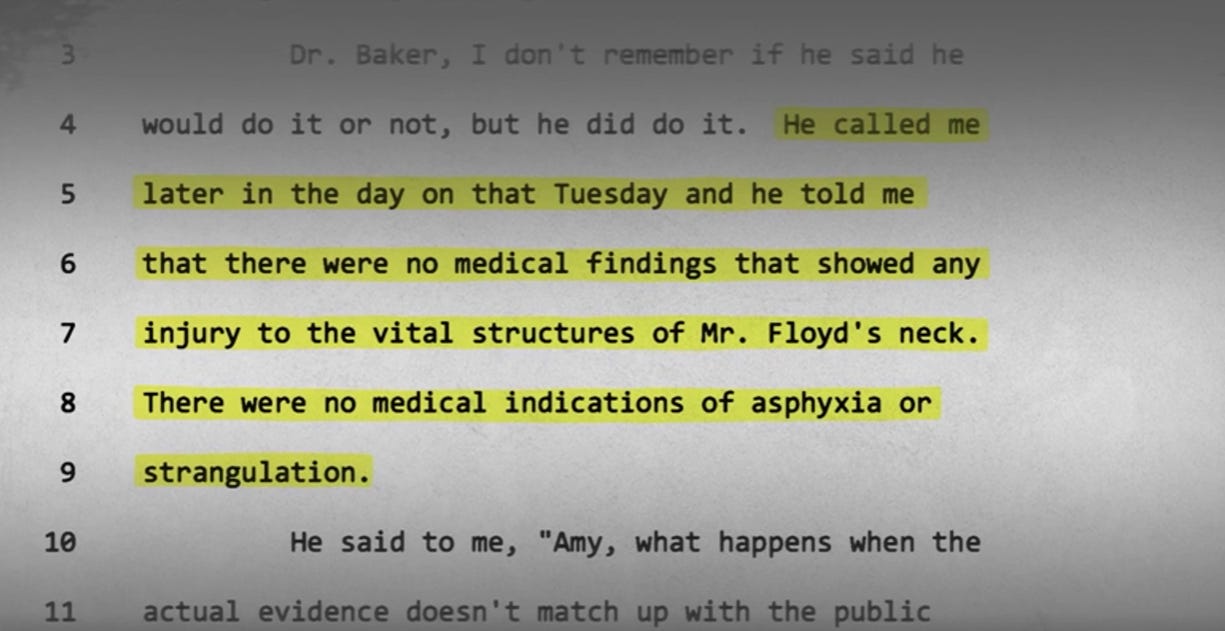 La substitut du procureur chargée du dossier a été appelée par le médecin légiste le jour de l’autopsie. Il lui a déclaré qu’il n’avait pas constaté de blessures ou d’ecchymoses sur le cou de George Floyd, qui ne présentait aucun signe d’asphyxie ou de strangulation. Le médecin légiste a poursuivi avec ces deux phrases sibyllines :”Que se passe t-il quand les preuves médico-légales sont en contradiction avec ce qu’a décidé l’opinion publique? C’est une affaire à foutre des carrières en l’air”.