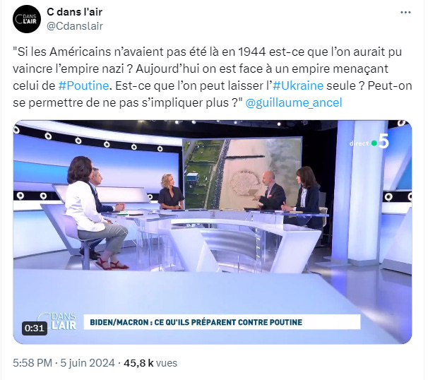 Nous n’épiloguerons pas sur la présence de Zelensky qui n’est plus président depuis le 20 mai alors que les Ukrainiens garnissaient le mur de l’Atlantique. Ni sur Joe Biden, sénilissime, qui voit des chaises où il n’y en a pas. Cette opération de communication a misérablement raté des deux côtés de l’Atlantique, résultat des élections européennes et sondages aux USA à l’appui.