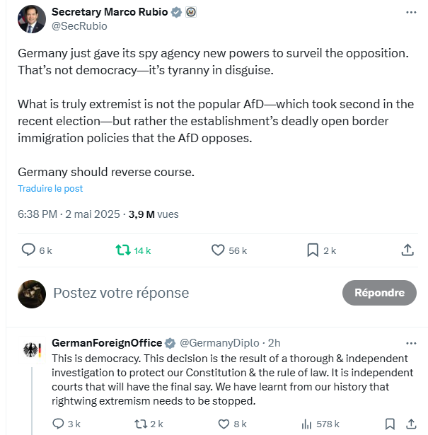 Le ministère des Affaires étrangères allemand répond à Marco Rubio. Au secrétaire d’État américain, qui critique à juste raison la décision d’utiliser le renseignement intérieur allemand pour surveiller et intimider l’AfD, promptement et officiellement classé comme parti extrémiste et danger pour la démocratie, les officiels allemands invoquent la démocratie. Tout cela serait fondé sur une enquête indépendante respectant l’état de droit – qu’on nous sert désormais à toutes les sauces.