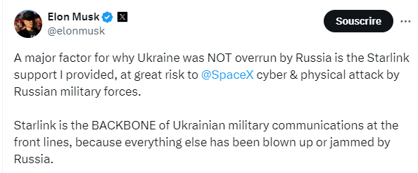 Pour les sceptiques qui trouveraient tout cela excessif, rappelons que l’infrastructure de contrôle et de commandement de l’armée ukrainienne a été détruite par les russes dès le début du conflit en moins d’un mois. Sans les terminaux Starlink offerts par Elon Musk qui permirent de restaurer ce contrôle et commandement, elle se serait complétement effondrée. Starlink, une constellation de satellites…