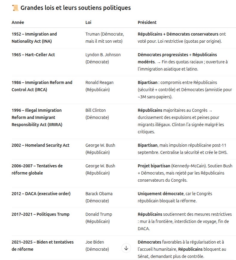En matière d’immigration, toutes les lois votées ont toujours dans l’histoire récente fait l’objet d’une forme de consensus bi-partisan ou d’une décision majoritaire. Sauf sous le second mandat de Barack Obama qui a pris le fameux décret présidentiel DACA (Deferred Action for Childhood Arrivals), parce qu’il avait échoué à faire adopter par le congrès le Dream Act1.