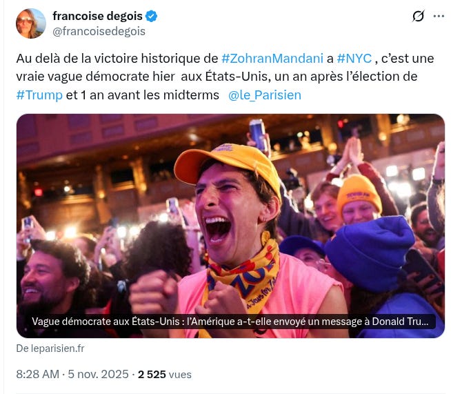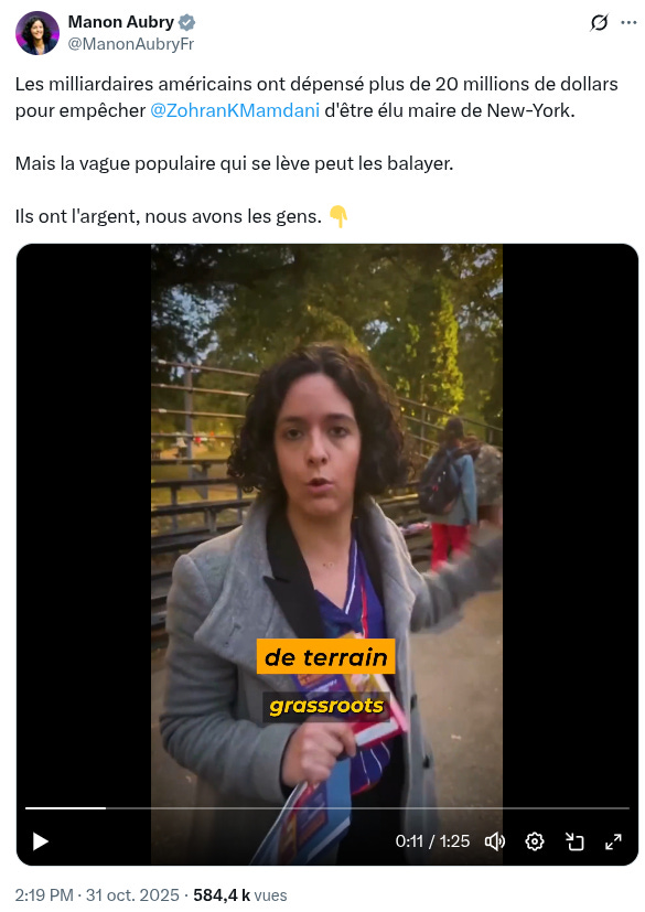 Manon Aubry, l’eurodéputée LFI, est allée faire campagne à New York pour “Zorhan”. Espérons qu’elle a financé son escapade à ses propres frais.