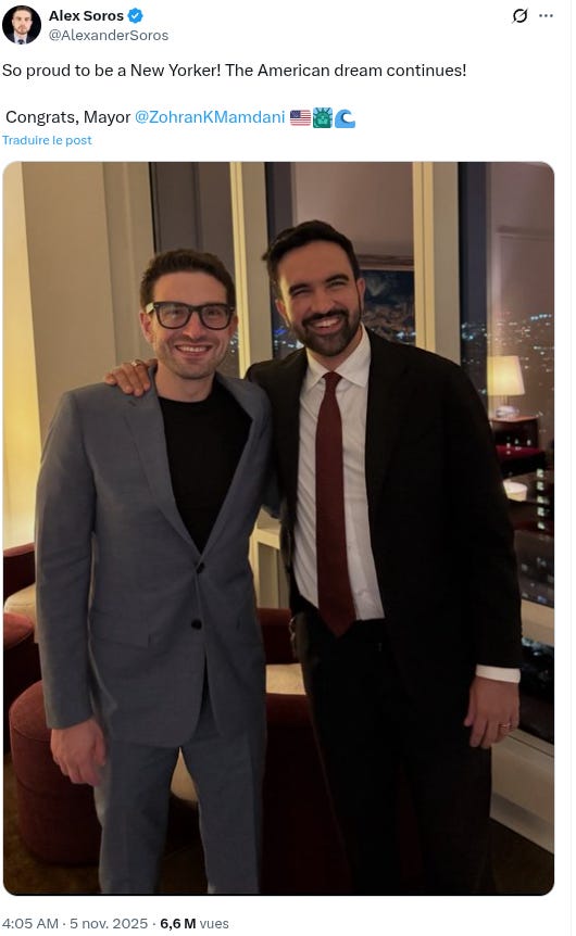 Il faut être aussi ignorant et/ou hypocrite que les partis politiques et élus français déjà en campagne pour les municipales de 2026 pour ne pas appréhender que Zohran Mamdani a été manufacturé par une partie de l’establishment, qui peut ainsi continuer à actionner un pantin. On pense bien sûr à des gens comme les Soros, Reid Hoffman et consorts. Même playbook que pour Barack Obama, mais à une échelle d’intensité bien inférieure.
