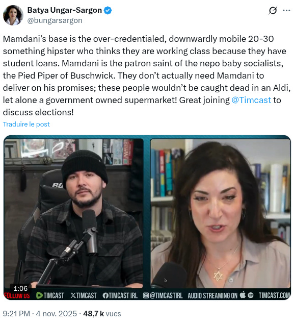“La base électorale de Mamdani est constituée des hipsters de 20-30 ans en cours de déclassement social qui résident à Bushwick et à Brooklyn. Ils croient faire partie de la classe ouvrière parce qu’ils n’ont pas obtenu de super jobs malgré leur accumulation de diplômes financés par des prêts étudiants. Ils méprisent le vrai travail, et exigent par conséquent tout de l’Etat, alors qu’ils comptent parmi les plus privilégiés de la planète. Mamdani est leur avatar. C’est un gosse de riche qui n’a jamais travaillé un jour dans sa vie, et qui fait croire que c’est génial d’être entretenu par ses parents à partir du moment où vous produisez du contenu cool sur les réseaux sociaux. Ses électeurs hipsters n’ont aucun intérêt à ce qu’il tienne ses promesses: ils ne mettront jamais les pieds chez Aldi, et encore moins dans un supermarché solidaire. Ces gens-là paient 12 dollars leur bière et pensent que la collectivité doit les payer pour faire des podcasts à la noix.”