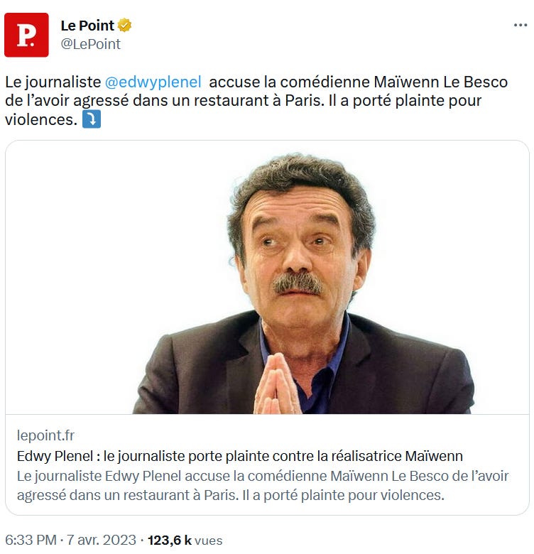 Les fourberies de Plenel. Stupeur et tremblement dans tout le petit Paris ! Son altesse médiatissime Edwy Plenel, alors qu’il festoyait dans une auberge de son fief de boboland (le 12e arrondissement), s’est fait tirer les cheveux par l’actrice-réalisatrice Maïwenn. Aucun dommage corporel mais “tout à fait attentatoire sur le plan moral et psychique”, peut-on lire dans la plainte du co-fondateur de Médiapart. Car oui, Edway Plenel est allé derechef saisir le bailli afin qu’au ban justice lui soit rendue.