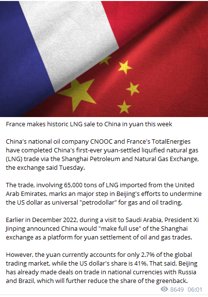 Il faut être un idiot abouti pour ne pas savoir que la majeure partie de “la finance” n’est pas réelle, et qu’il est beaucoup plus simple de créer un système financier et de règlement alternatif que de bâtir des secteurs industriels entiers ainsi que les infrastructures et voies d’approvisionnement nécessaires. La simple signature d’un accord multilatéral suffit, et l’intendance suit… La preuve. La bourse de Shanghai dédiée au pétrole et au gaz le fait déjà. Total y vend du gaz à la Chine en yuan, en utilisant son système de règlement.