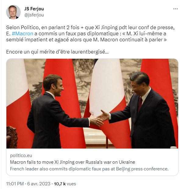 Canard laqué. Macron a parlé deux fois plus longtemps que Xi-Jinping lors de leur conférence de presse commune. Faute diplomatique lourde, comportement irrespectueux vis-à-vis son hôte, ignorance que faire perdre la face en Asie n’est pas toléré.