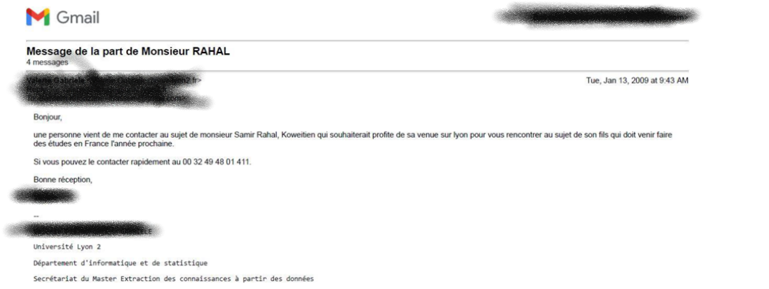 Arrivé en France en octobre 2008, il a été “tamponné” dès janvier 2009. Le secrétariat de son master à l’université Lyon 2 l’a informé qu’un ressortissant koweïti du nom de Samir Rahal1 souhaitait s’entretenir avec lui car son fils allait faire ses études en France.