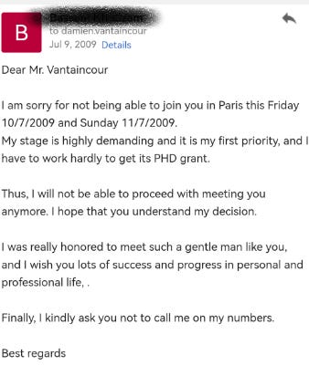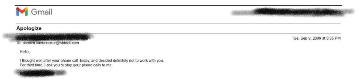 Mais les compères Rahal et Vantaincour ne l’entendirent pas de cette oreille et insistèrent jusqu’à ce que M X se sentit dans l’obligation de mettre les points sur les i en septembre 2009, neuf mois après la première approche effectuée par Samir Rahal. Les appels cessèrent quand il menaça d‘en référer à la police.