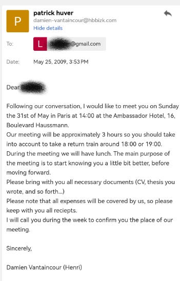 Samir Rahal présente à M.X un de ses amis, Damien Vantaincour (se faisant également appeler Henri ou Patrick Huver), se prétendant français et senior project manager dans une société d’informatique, Honey Bird Business Knowledge Consulting, sise 26 bd Royal, 2449 Luxembourg. Ce Damien Vantaincour utilisait également un numéro de portable prépayé belge, +32 494 633 448. Etonnant pour quelqu’un qui prétend vivre au Luxembourg.