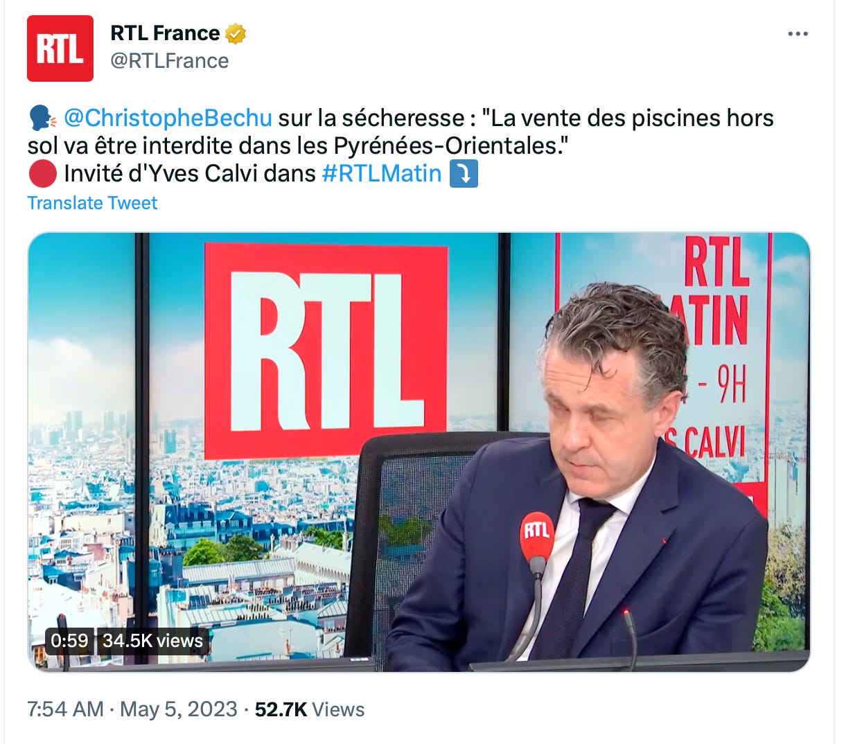 Béchu hors-sol - La vente des piscines hors sol va être interdite dans les Pyrénées-Orientales. “ Le dérèglement climatique c'est maintenant, il faut qu'on sorte de la culture de l'abondance”, s’est fendu le ministre de la Transition écologique Christophe Béchu sur RTL.