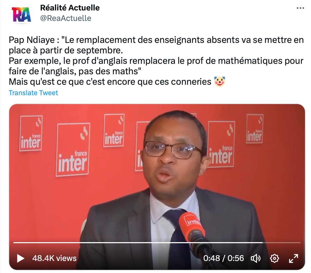 (-) + (-) = + (leçon de mathématiques selon Pap Ndiaye) - “C’est par exemple le professeur d’anglais qui va remplacer le professeur de mathématiques, non pas pour faire des mathématiques mais pour faire de l’anglais […]. Les mathématiques seront rattrapées une autre fois lorsque le professeur d’anglais sera absent et que le professeur de mathématiques pourra le remplacer”.