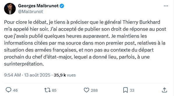 Le post de George Malbrunot est, il fallait s’y attendre, devenu viral. Au point que le général Burkhard l’a appelé le jour même en exigeant un droit de réponse, ce à quoi George Malbrunot a consenti.