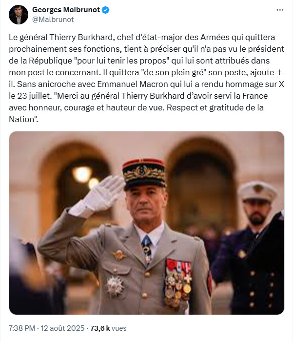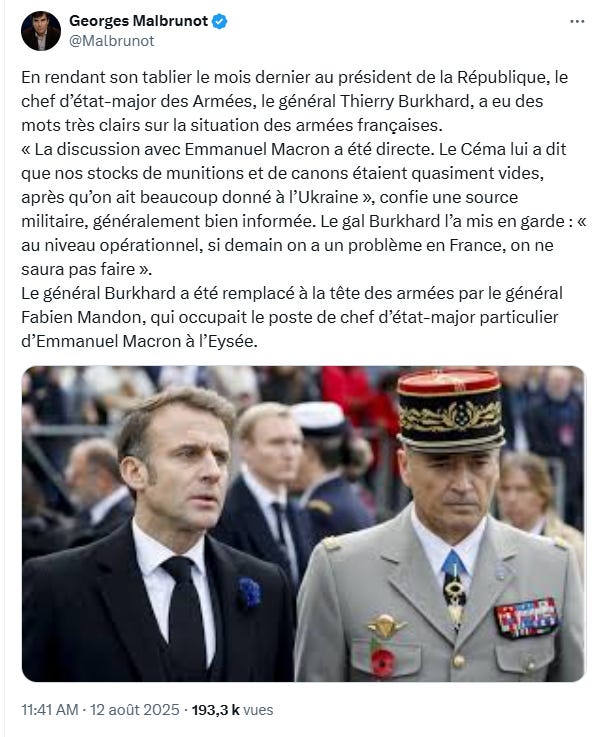Georges Malbrunot, grand reporter au Figaro, a rapporté dans un post sur X, le 12 août 2025, la teneur de la conversation qu’a eue le chef d’état-major des armées, le général Burkhard, avec Emmanuel Macron, une conversation qualifiée de « franche ». Nos armées sont dans un état calamiteux à tous points de vue, le moral est dans les chaussettes.