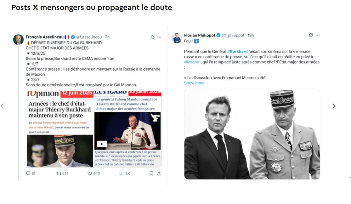 “Ces fake news sont relayées en particulier par des comptes de la sphère pro-russe qui cherchent explicitement à porter atteinte à l’image du CEMA et à fragiliser la cohésion de nos armées. Ce ciblage s’explique car le CEMA rappelle régulièrement la réalité de la situation opérationnelle, et en particulier que la Russie représente une menace réelle pour la France.” nous disent les décérébrés de la communication du ministère des Armées.