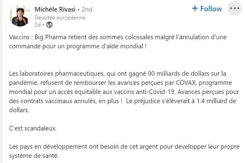 L’amère pilule. “Les pays en développement ont besoin de cet argent pour développer leur propre système de santé”, plaide l’eurodéputée écolo française Michèle Rivasi au parlement européen après le refus des laboratoires pharmaceutiques, révélé par le New York Times, de rembourser les avances perçues du programme d’aide mondiale Covax dans le cadre des contrats d’achats anticipés de vaccins, contrats annulés entre temps.