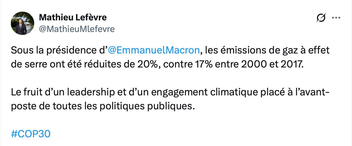 Le ministre de la transition écologique ne dit pas autre chose quand il relaie avec une rare subtilité, le propos d’Emmanuel Macron. “Les émissions de gaz à effet de serre ont été réduites de 20 %, contre 17 % entre 2000 et 2017”, s’enthousiasme Mathieu Lefèvre. Traduction : en huit ans, notre PR aura fait mieux et surtout deux fois plus vite – puisque c’est autant de GES que de Macron que le ministre parle.