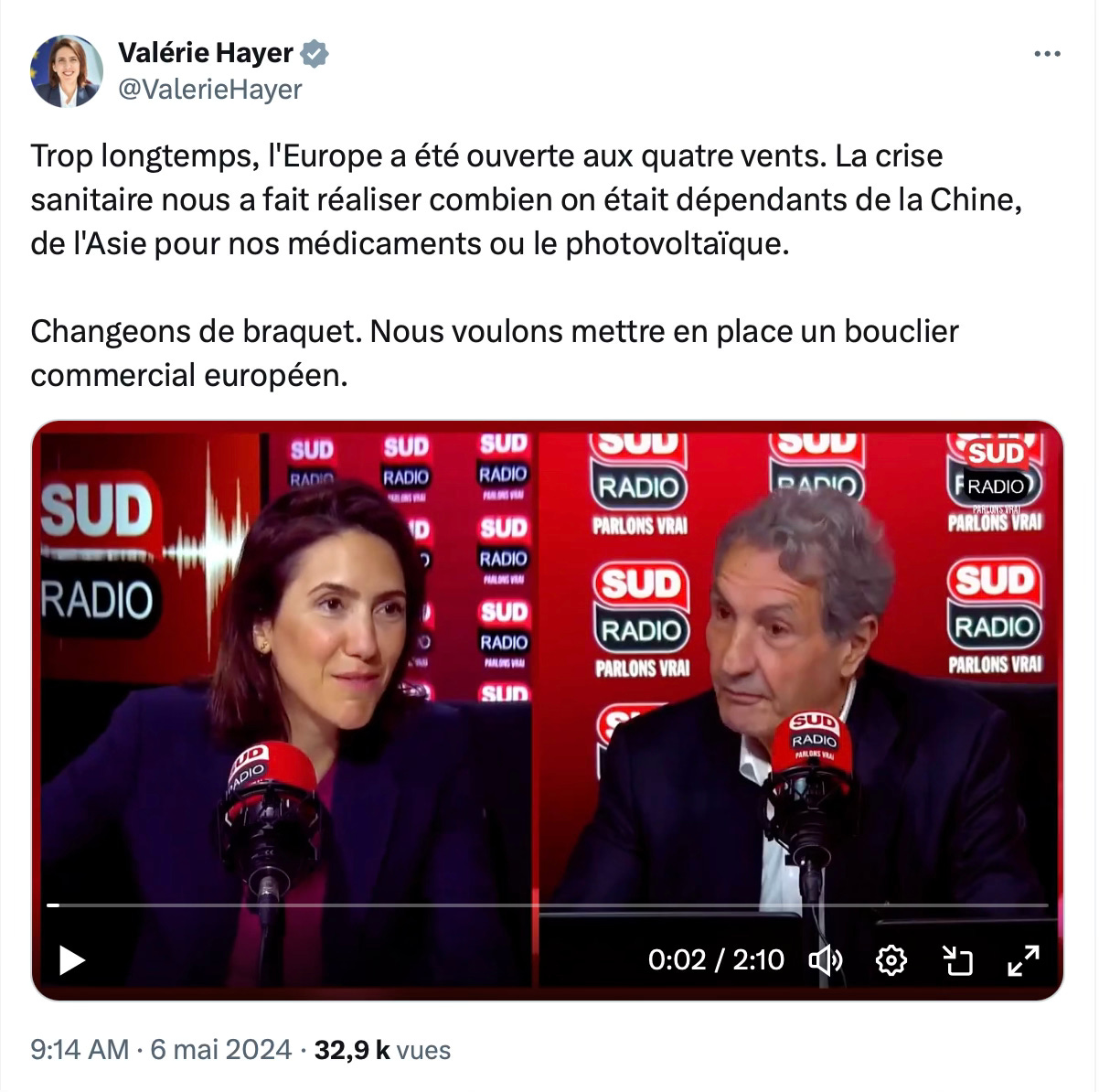 Magie du processus électoral, la candidate Renaissance aux Européennes déclare vouloir se convertir au protectionnisme. Tout en ayant fait et en faisant l'exact inverse.