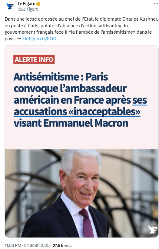 The French media is broadcasting U.S. Ambassador Charles Kushner’s accusation that Paris is failing to tackle antisemitism. Let’s revisit our December 1, 2024, article, which exposes Kushner’s true character and checkered past, revealing why he’s hardly suited to deliver sanctimonious lectures. Looking back, Donald Trump’s choice of Kushner as his envoy to Paris is a misstep, prioritizing family ties over credibility in a role demanding finesse and savoir-vivre.