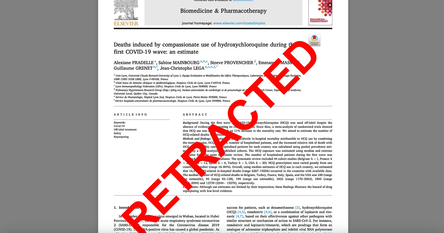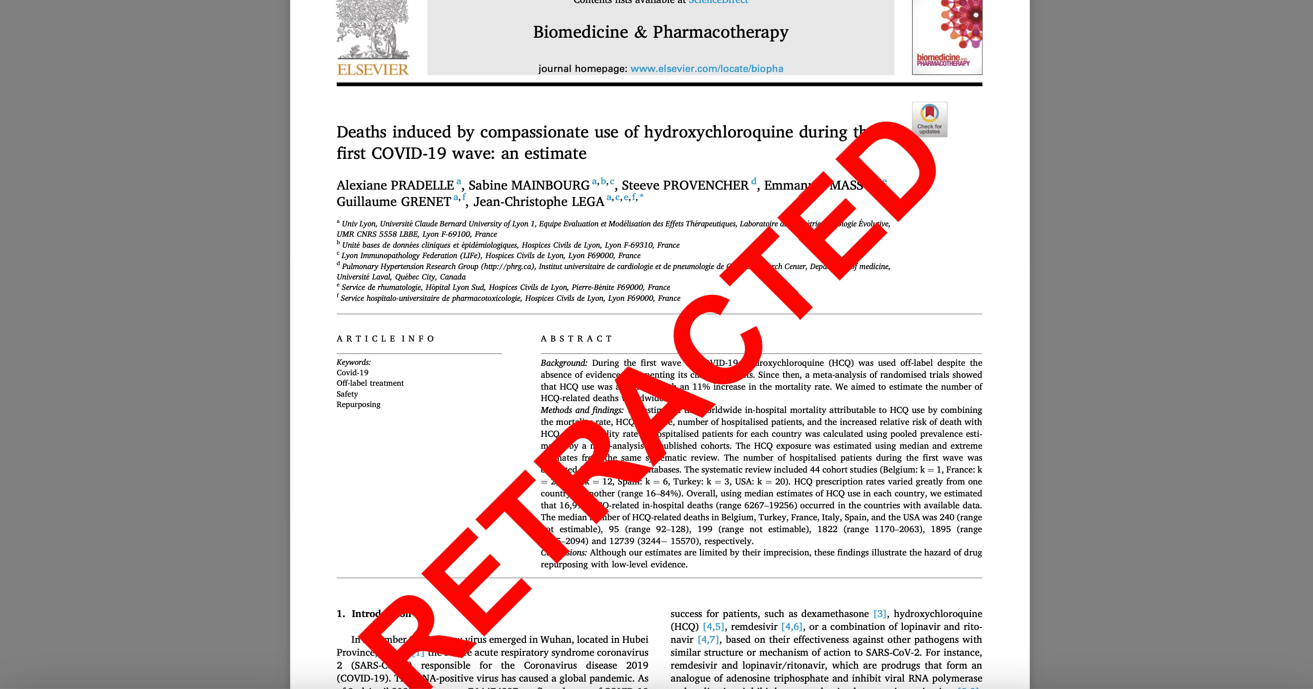 Après “l’étude” de The Lancet publiée puis vite retirée en 2020 qui suggérait que l’hydroxychloroquine (HCQ) augmentait la mortalité et les arythmies cardiaques chez les patients hospitalisés pour Covid-19, une autre étude, française, mettant en cause l’anti-paludéen dans sa réponse au SARS-CoV-2, vient d’être rétractée.