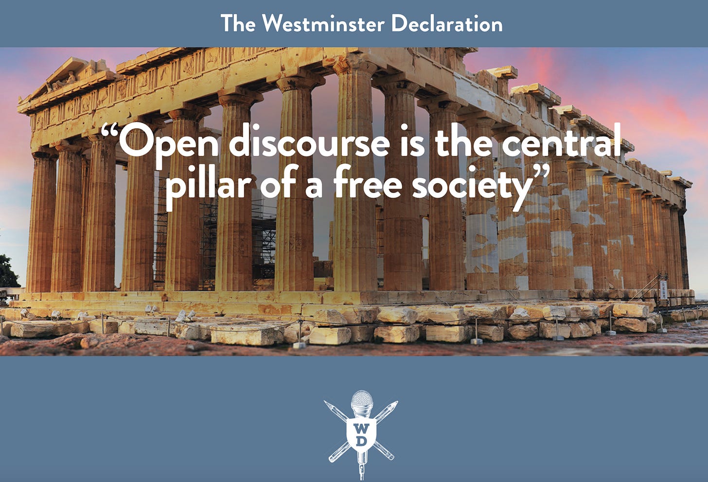 Cette déclaration est le résultat d’une première réunion de défenseurs de la liberté d’expression du monde entier qui se sont réunis à Westminster, à Londres, fin juin 2023. En tant que signataires de cette déclaration, nous avons des désaccords politiques et idéologiques importants. Cependant, ce n’est qu’en nous unissant que nous parviendrons à vaincre les forces envahissantes de la censure afin que nous puissions maintenir notre capacité à débattre ouvertement et à nous défier les uns les autres. C'est dans un esprit de diversité et de débat que nous signons la Déclaration de Westminster.