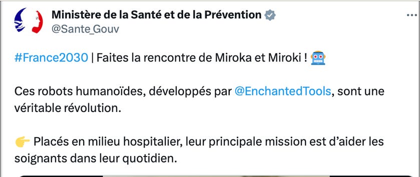 Attention, révolution à venir dans le monde de la santé. Ce n'est pas nous qui le disons mais les services d'Aurélien Rousseau. L'hôpital s'apprête (enfin, pas avant 2025) à accueillir Miroka et Miroki, des robots humanoïdes, développés par la société EnchantedTools. L'hôpital façon start-up nation quoi.