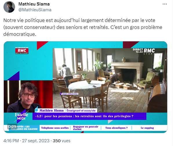 Matthieu Slama, chroniqueur, écrivain et enseignant en communication au Celsa, fils d'Alain-Gérard Slama, historien et journaliste au Figaro (et président de la Fondation de l'École normale supérieure, vice-président du groupe des personnalités qualifiées au Conseil économique, social et environnemental, membre du Conseil d'analyse de la société auprès du Premier ministre, membre du Comité consultatif national d'éthique, membre de la Commission nationale consultative des droits de l'Homme, membre du conseil scientifique de la Fondation pour l'innovation politique, membre du jury du prix Alexis-de-Tocqueville. Il a aussi été membre du RPR et du conseil d'orientation de l'Institut Montaigne) et de Catherine Royer, éditrice, affirme que les deux principes fondamentaux de la démocratie depuis la Grèce antique – un citoyen une voix; la majorité gouverne et la minorité s'oppose – est un problème démocratique, parce que des électeurs âgés ne votent pas comme lui le souhaite.