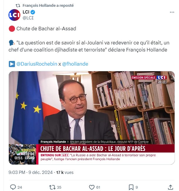 Nous ne nous attarderons pas sur tous les idiots, de Joe Biden à Ursula von der Leyen en passant par Emmanuel Macron, qui se félicitent de la chute d’un dictateur. Au temps pour nous, nous allons nous appesantir sur François Hollande qui a armé ces djihadistes à partir de 2012, causant par contrecoup les attentats du Stade de France et du Bataclan en 2015.