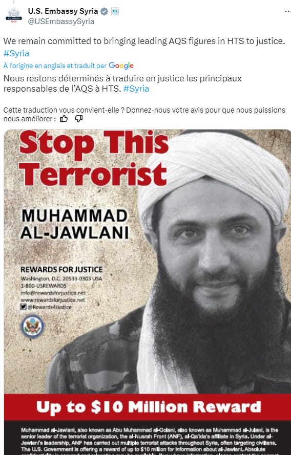 C’est la beauté des réseaux sociaux. Il n’a pas fallu deux minutes pour que réapparaisse ce tweet officiel datant de 2017 par lequel la diplomatie américaine rappelle que le chef de “rebelles”, Abou Mohammad al-Jolani, leader du Front Al Nosra (les copains de Laurent Fabius et François Hollande) devenu Hayat Tahrir al-Cham est un terroriste sanguinaire qui a massacré de Bagdad à Idlib depuis vingt ans, qui est passé par Daech puis Al Qaeda, grand trafiquant de captagon qui doit être traduit en justice. Une récompense de 10 millions de dollars est offerte à toute personne disposant d’information à son sujet. Elle est toujours valide.