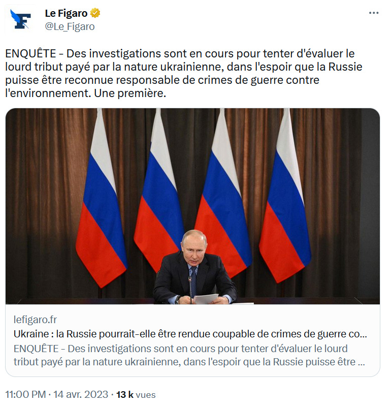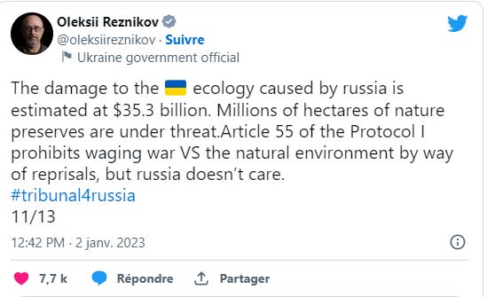 Les fous dirigent l’asile. Et cette brillante idée de “crime de guerre contre l’environnement” provient des Ukrainiens. Du corrompu ministre de la défense. Gageons que trop occupé à s’enrichir sur les rations de combat de son armée, ce sont l’une des nombreuses officines américaines qui lui mettent les mots dans la bouche le conseillent qui le lui ont soufflé.