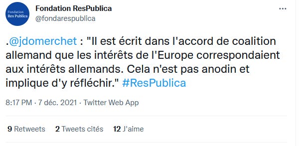 Ainsi donc la nouvelle coalition allemande a inscrit dans son accord de gouvernement que les intérêts de l’Europe sont ceux de l’Allemagne. Et Olaf “Papa” Scholz et ses partenaires écologistes et libéraux promettent de relan…