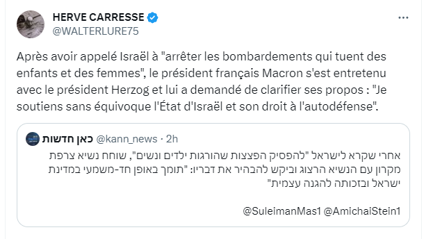 Quant aux retournements de veste erratiques d’Emmanuel Macron, dont l’incompréhension du monde et le manque d’épine dorsale sont avérés depuis 2017, est-il encore besoin d’en parler ? Après son interview à la BBC où dans un anglais aussi approximatif que zézéyant il a demandé un cessez-le-feu, il vient de baisser son pantalon devant le président israélien qui exigeait des explications. Sa réponse : “Je soutiens sans équivoque l’Etat d’Israël et son droit à l’autodéfense”.