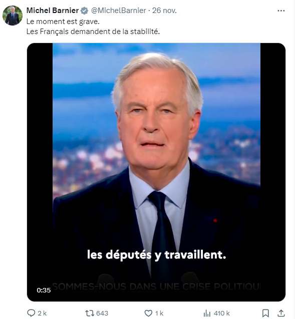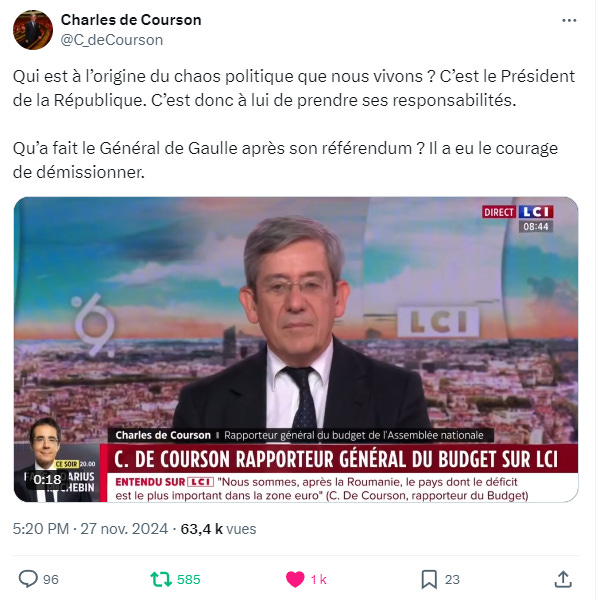 L’affaire est simple. Les seuls responsables du chaos actuel sont Emmanuel Macron et les siens. Et Giscard et les siens; et Mitterrand et le siens; et Chirac et les siens; et Sarkozy - 600 milliards en 5 ans - et les siens; et Hollande et Macron . Pas comme s’ils n’étaient aux manettes que depuis deux ans et n’étaient pas responsables d’une explosion de la dette publique de plus de 1 200 milliards d’euros depuis 2017. C’est Emmanuel Macron qui seul est responsable du blocage politique actuel, puisqu’il a décidé seul de la dissolution, de “leur lancer une grenade dans les jambes”.