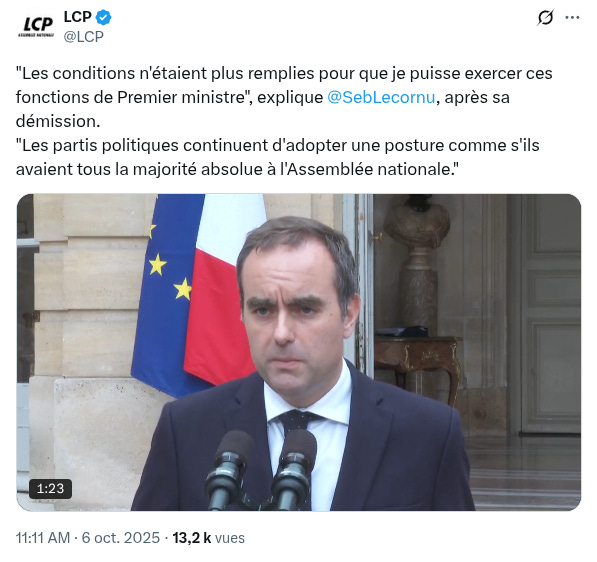 Ce matin, Sébastien Lecornu a remis sa démission à Emmanuel Macron, qui l’a acceptée. Et bien évidemment, tous les corne-culs de gauche, Olivier Faure et François Hollande en tête, « se tiennent prêts » à gouverner alors qu’aucun des groupes parlementaires qui constituent cet invraisemblable équipage qu’est le Nouveau Front populaire qui n’est d’accord sur rien, ne détiendra de majorité et sera immédiatement censuré. Jean-Luc Mélenchon réclame une réunion d’urgence du NFP, manœuvre qui ne vise qu’à l’asseoir comme le candidat naturel de la gauche. Gros comme un camion.