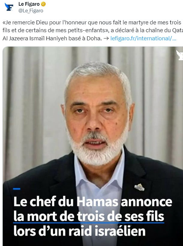 Pourquoi donc le président de la République, le premier ministre, des parlementaires ou d’autres n’ont ils pas saisi la justice des crimes perpétrés par le Hamas, dont la direction est connue ? Pour ne pas déplaire au Qatar qui l’abrite ?