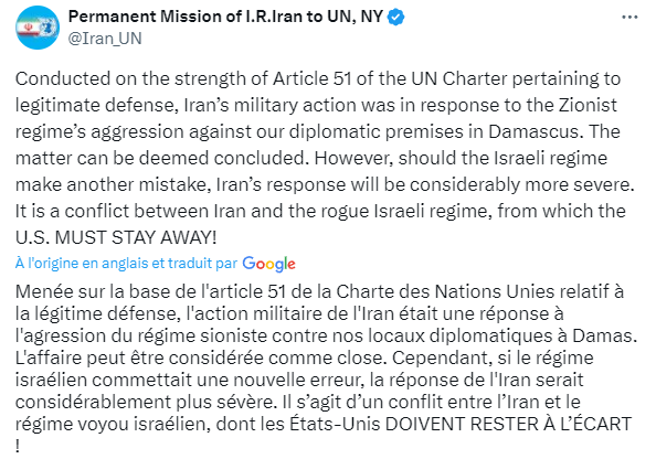 Comme nous l’avions prévu (nous sommes loin d’être les seuls), l’Iran a riposté à la frappe israélienne sur son consulat à Damas, en arguant de l’article 51 de la Charte de l’ONU. Avec mesure. En envoyant un message clair.