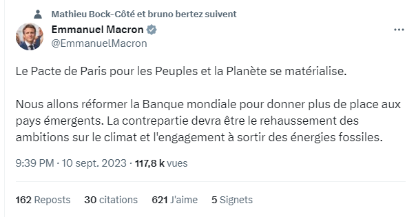 Mais Emmanuel Macron persiste à faire du chantage à l’aide au développement. Pas question de démocratie cette fois-ci mais de… réchauffement climatique.