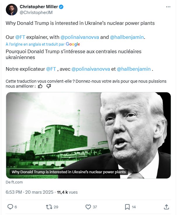 En voulant contrôler l’ensemble de la filière nucléaire ukrainienne, Trump ne cherche pas tant à faire du business qu’à éradiquer définitivement les risques de prolifération et de terrorisme. Et cela passe par retirer aux Ukrainiens leurs centrales nucléaires, leur accès au combustible comme aux déchets et à contrôler serré les individus possédant des compétences transférables du domaine civil au militaire.