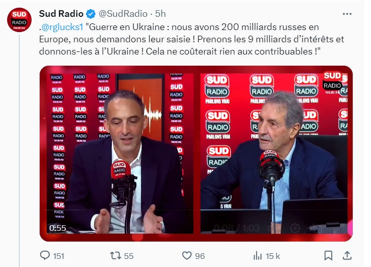 Il suffit de voler 200 milliards d’euros à la Russie ! Vous voyez les intérêts des actifs de la banque centrale et des entreprises russes - autant de créances qu’elles détiennent sur nous ? Donnons les à l’Ukraine, ça ne coûtera rien au contribuable ! Vu le niveau de stupidité et d’incompétence de M. Glucksmann, espérons qu’il perdra son siège d’Eurodéputé français l’an prochain. Les intérêts courent. Ils sont dus quoi qu’il arrive. Il sont indissociables des actifs qui les génèrent et ne sont pas aliénables sans décision du Conseil de sécurité de l’ONU. Les contribuables, quoi qu’il arrive, paieront.