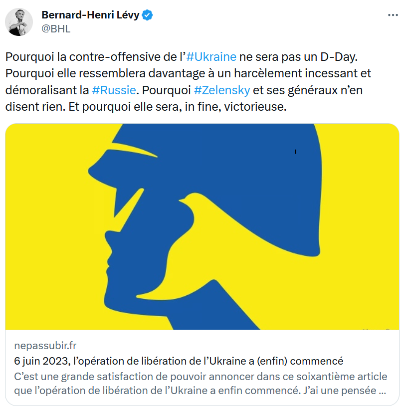 Si l’on en croit ce grand stratège des salons parisiens qu’est BHL, la “stratégie” ukrainienne consisterait à harceler les défenses russes alors des combats de harcèlement n’ont de sens que dans le cadre d’une guerre de mouvement, pas contre des défenseurs bien retranchés. BHL nous dit là que les Ukrainiens tirent au paint-ball sur des murs en béton… Des piqures de moustiques démoralisent-elles un éléphant?
