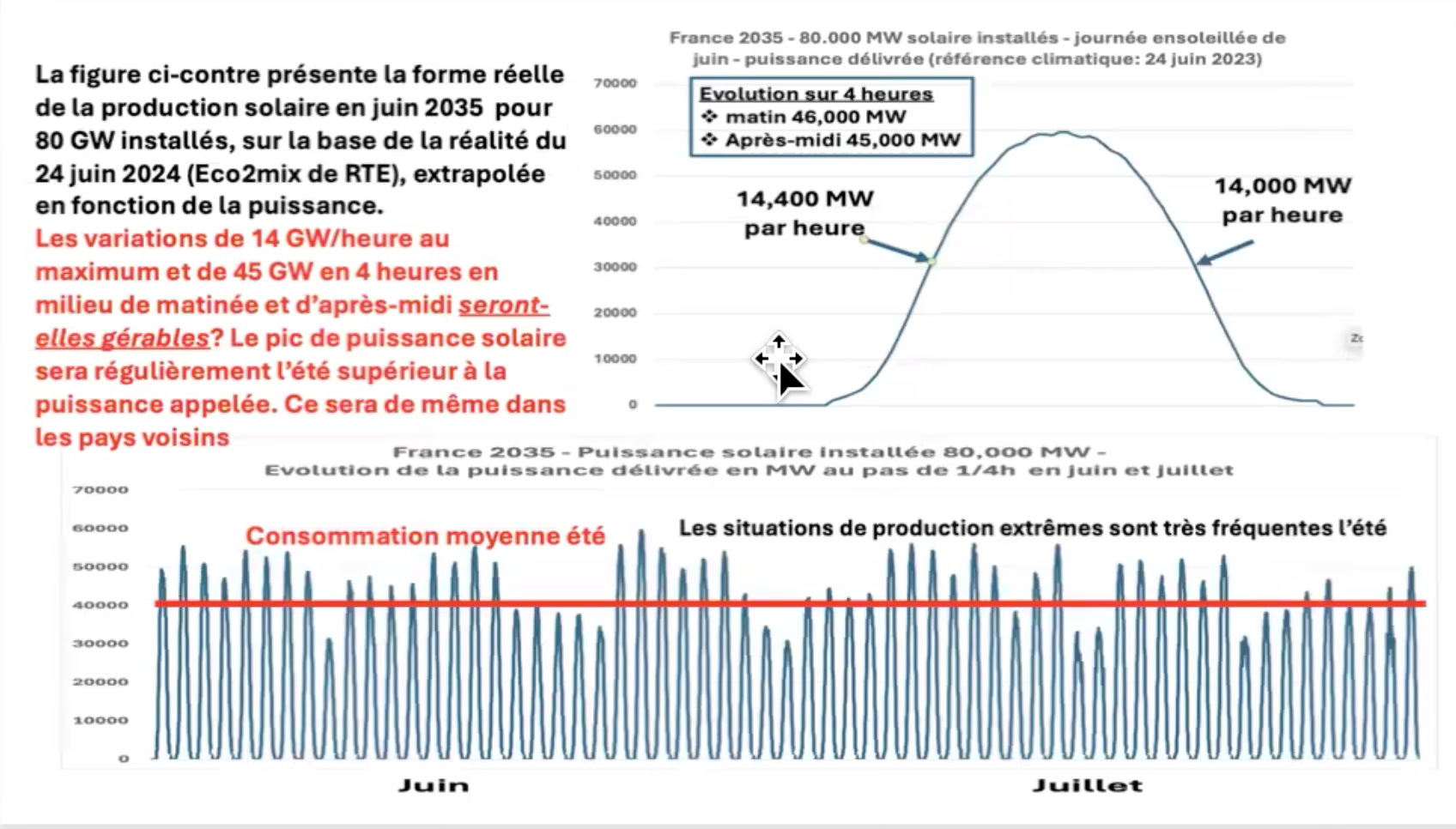 Avec 80 GW de solaire, en milieu de matinée et en milieu d'après-midi, les variations sont de 14 gigawatts par heure. C’est l’équivalent de la production de 14 réacteurs. Est-ce qu'on est prêt à encaisser dans dix ans une variation de puissance solaire qui est 14 de gigawatts par heure ? C'est exactement ce qui est arrivé à l'Espagne.