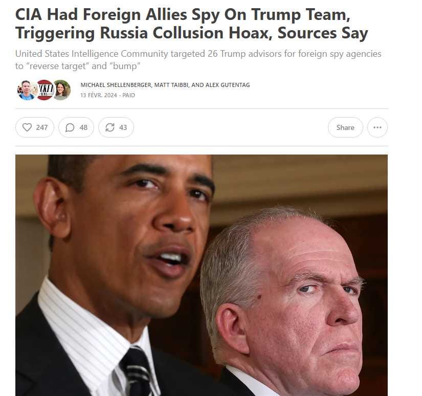Le trio de journalistes Matt Taibi (Twitter files), Micheal Schellenberger (Twitter files aussi) et Alex Gutentag viennent de déterrer un rapport classé top secret qui démontre que la "communauté du renseignement" américaine a demandé à des services alliés d'espionner pour son compte la campagne de Trump et certains de ses conseillers bien avant l'été 2016... Communauté du renseignement = la Maison Blanche…