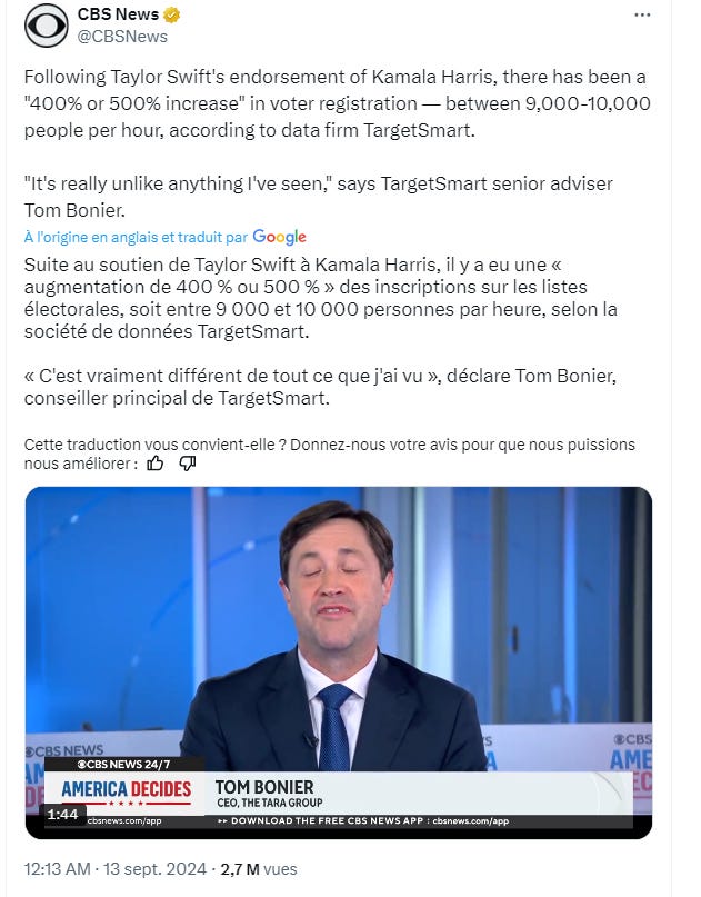 Pour bien prendre la mesure du niveau de corruption (pas d’autre mot) des médias américains, un exemple. Sur CBS, Tom Bonier, l’ancien patron et aujourd’hui conseiller d’une entreprise nommée TargetSmart, s’extasie sur l’augmentation géométrique des inscriptions sur les listes électorales qu’aurait provoqué le soutien de Taylor Swift à Kamala Harris – ce qui est au demeurant une infox.
