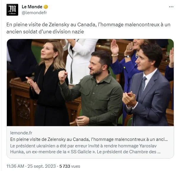 Extrait - Quand Le Monde qualifie de “malencontreuse” la glorification d’un ancien SS ukrainien, nous voyons les ravages d’une presse aux ordres et militante. Trudeau, le Canada et l’Ukraine, c’est le camp du bien. Il s’agit donc de minimiser leurs turpitudes, mêmes les pires, mêmes celles qui relèvent du révisionnisme le plus vomitif et insultant, entre de trop nombreux autres, la mémoire des 44 090 soldats canadiens morts au combat contre l’Allemagne nazie.