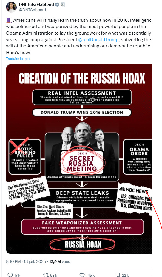 Tulsi Gabbard, directrice nationale du renseignement des États-Unis, a déclassifié plus de 140 pages qui confirment, au-delà de tout doute raisonnable, que la manipulation du Russiagate, concernant l'ingérence russe dans l'élection présidentielle de 2016, trouve son origine au plus haut sommet de l'État américain. Cette affaire est plus importante que le Watergate, l'Iran-Contra, le Chinagate, les armes de destruction massive de Saddam Hussein et l'affaire Epstein réunies.