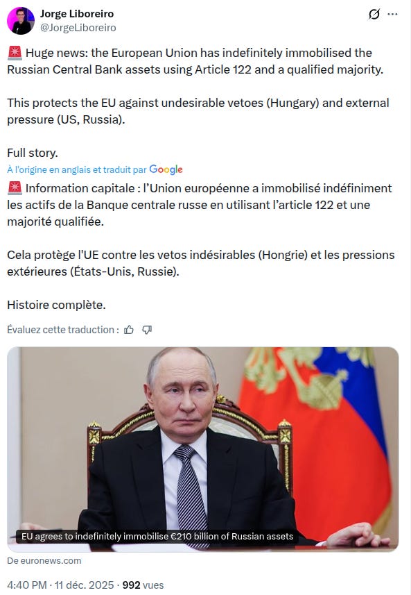 To permanently freeze Russia’s sovereign assets, the European Council—more precisely Coreper, the club of permanent representatives made up of ambassadors who dutifully follow their governments’ orders—has, at the Commission’s prompting, decided by qualified majority to invoke Article 122 of the Treaty on the Functioning of the European Union (TFEU). The goal? To sidestep any inconvenient vetoes. A procedural workaround dressed up as statesmanship.