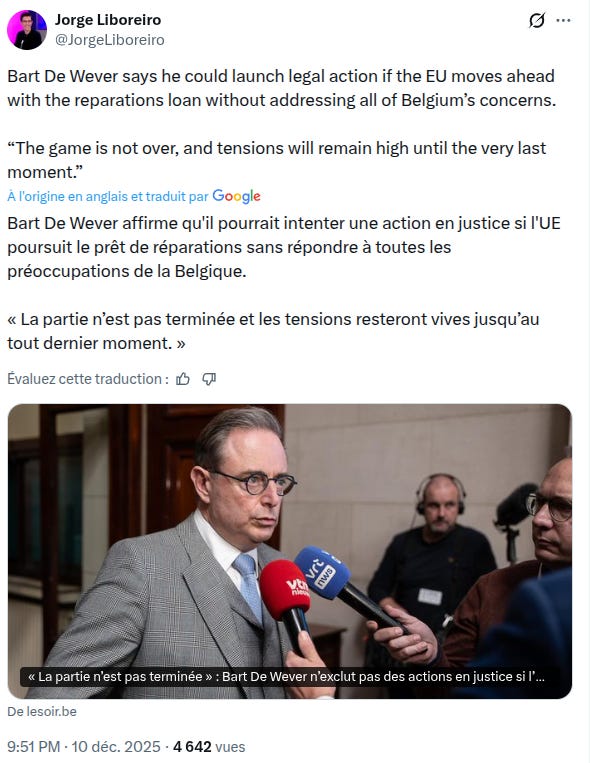 The day before yesterday, Belgian prime minister Bart De Wever has openly declared that he is not going to "steal" (he used that word) the property of a country Belgium is not at war with. He will go to the European Court of Justice if necessary.