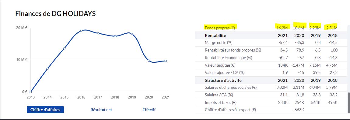DG Holidays opère depuis 2018 avec des fonds propres négatifs. Cette entreprise aurait donc du être dissoute en 2021. Société à responsabilité limitée au capital de 10 000 euros, elle présente après l’abandon de 7,8 millions d’euros de créances détenues par DG Hotels (c’est le système Bensaïd de ponction des trésoreries contre l’émission de créances interentreprises, de simples jeux d’écriture sans actifs en face) des fonds propres négatifs de 8,5 millions d’euros. Nous répétons: 10 000 euros de capital social et -8,5 millions de fonds propres. Au 12 octobre 2023, les fonds propres n’ont donc pas été reconstitués dans les comptes. Or, ce sont les comptes qui comptent.